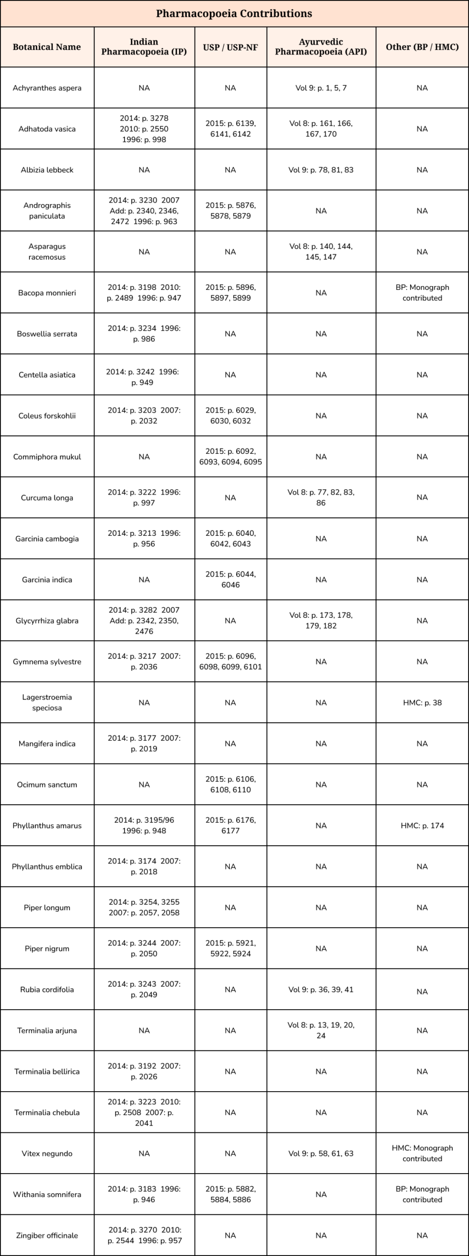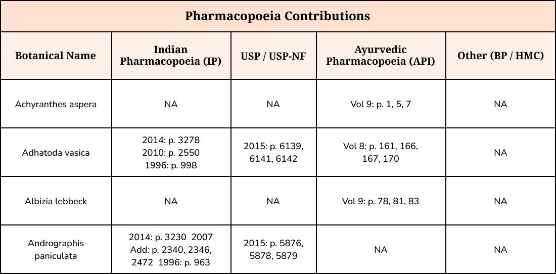 This table summarizes the analytical monographs contributed by your team to the Indian Pharmacopoeia (IP), United States Pharmacopeia (USP), Ayurvedic Pharmacopoeia of India (API), and others.